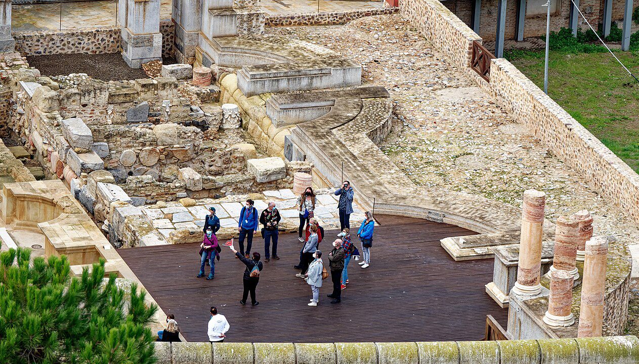 Tenía capacidad para unos 7000 espectadores y estuvo en uso hasta el siglo III, a partir del cual se fueron superponiendo diferentes construcciones. En 1988 fue redescubierto y exhumado. Al haber estado cubierto por sucesivas capas de ocupación (bizantina, andalusí, bajo-medieval…) el teatro estaba oculto y no se tenía ninguna constancia de su existencia. Esta ocultación permitió que una elevada cantidad del material original del teatro se conservara in situ y hasta un 60% de los materiales originales estuvieran enterrados.